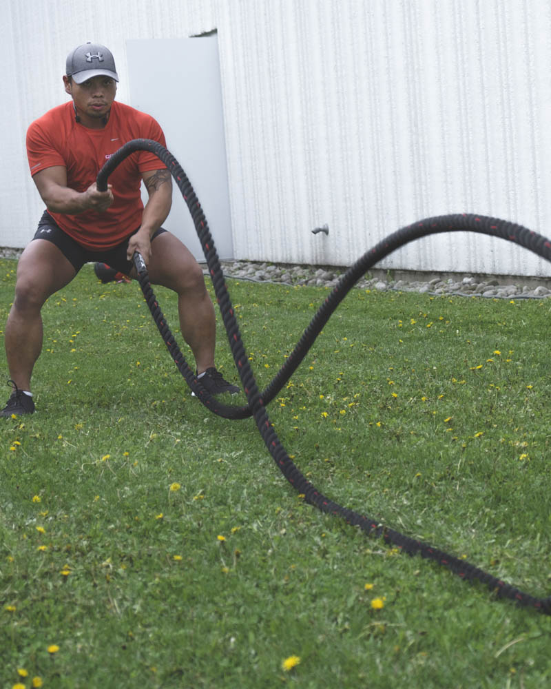 The goal is to always keep the rope moving, so you’re constantly engaging your legs, upper body and core muscles – while you burn loads of calories. This constant motion adds an explosive and dynamic aspect to your workout that you just don’t get with traditional weight training.