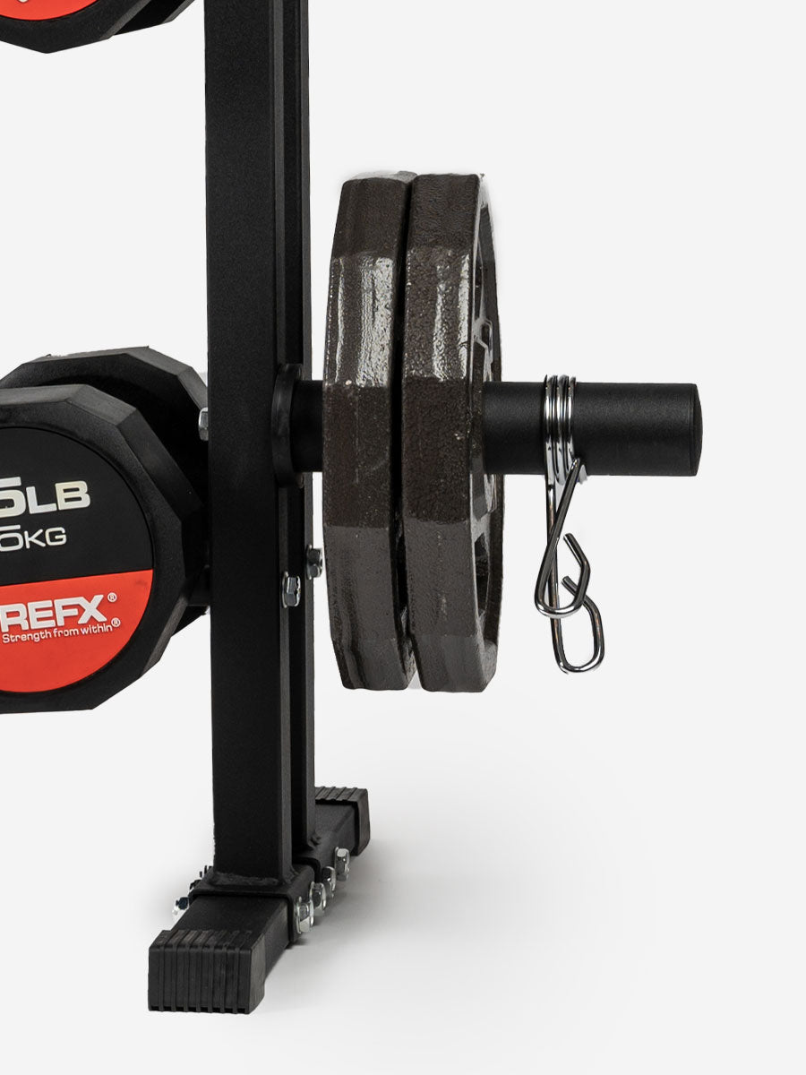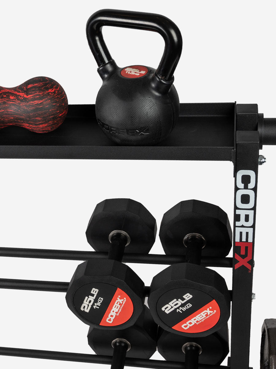 Keep all of your gym gear in one place with 3-tiers of dumbbell and kettlebell shelving and 4 posts with spring collars for olympic weight plates!