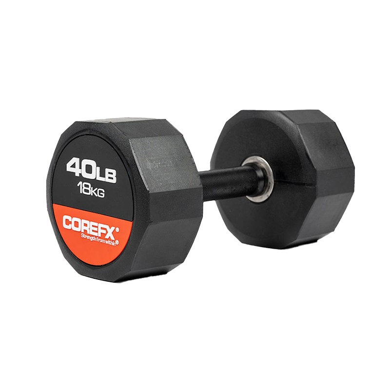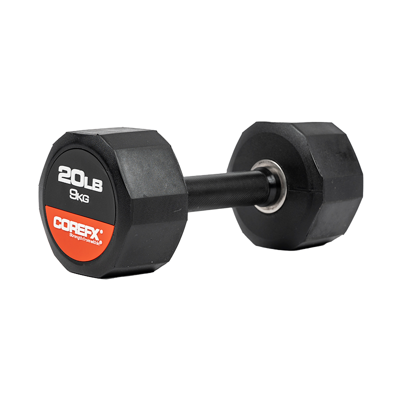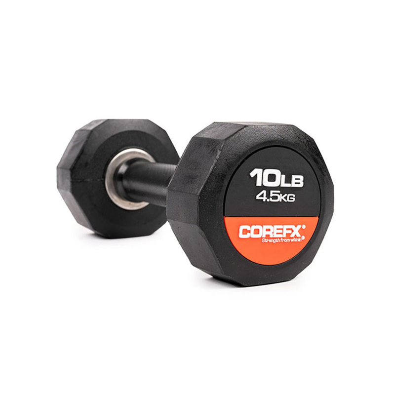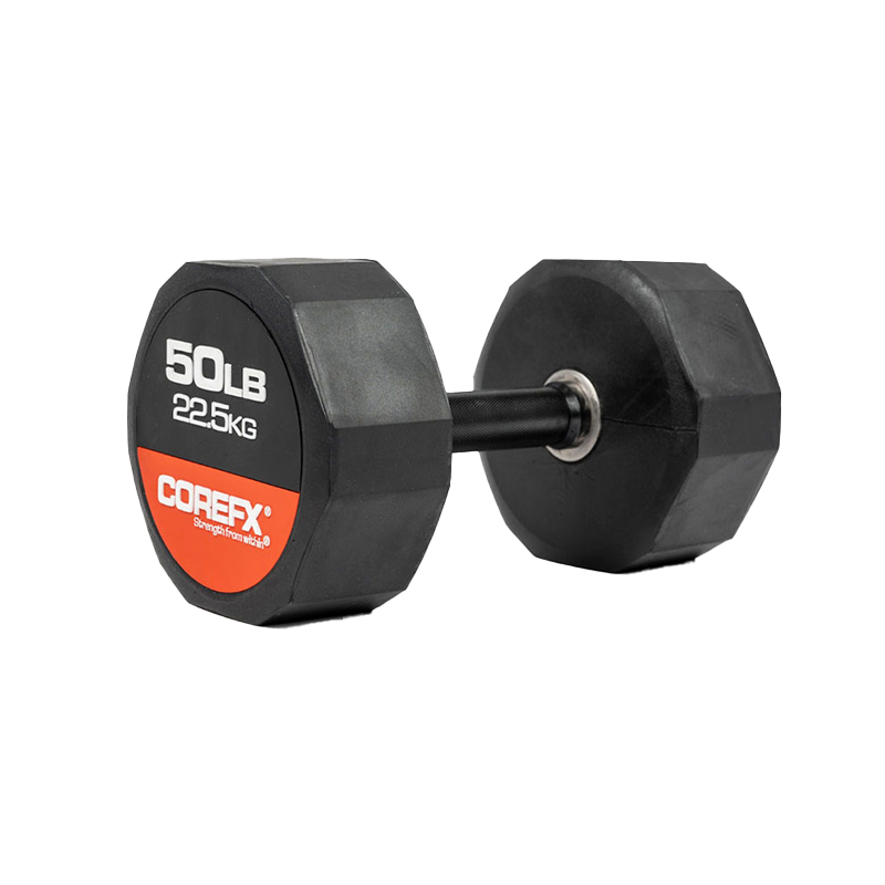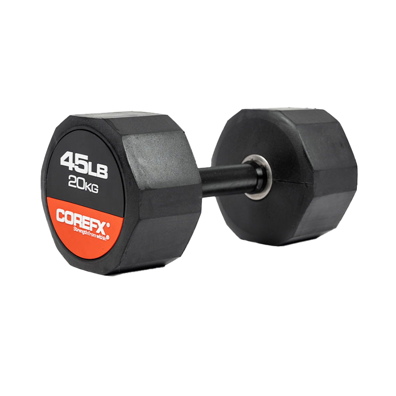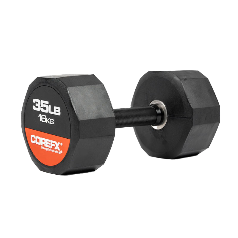 The COREFX rubber dumbbell features a precision-machined handle that maintains the same length across various weights. This ensures a safe grip and optimal use throughout your workouts.