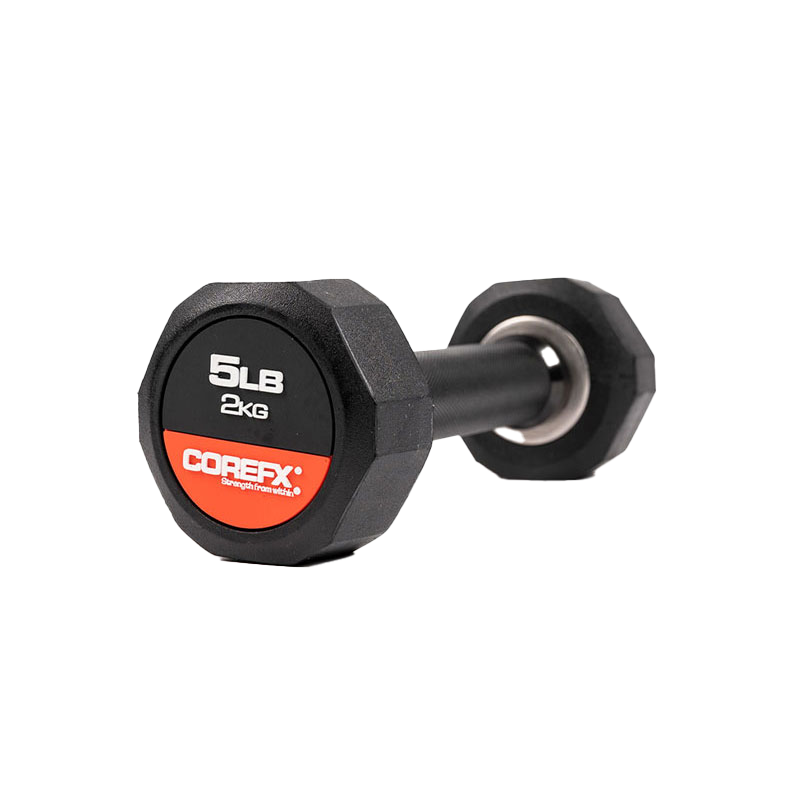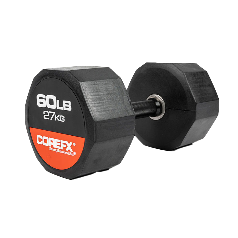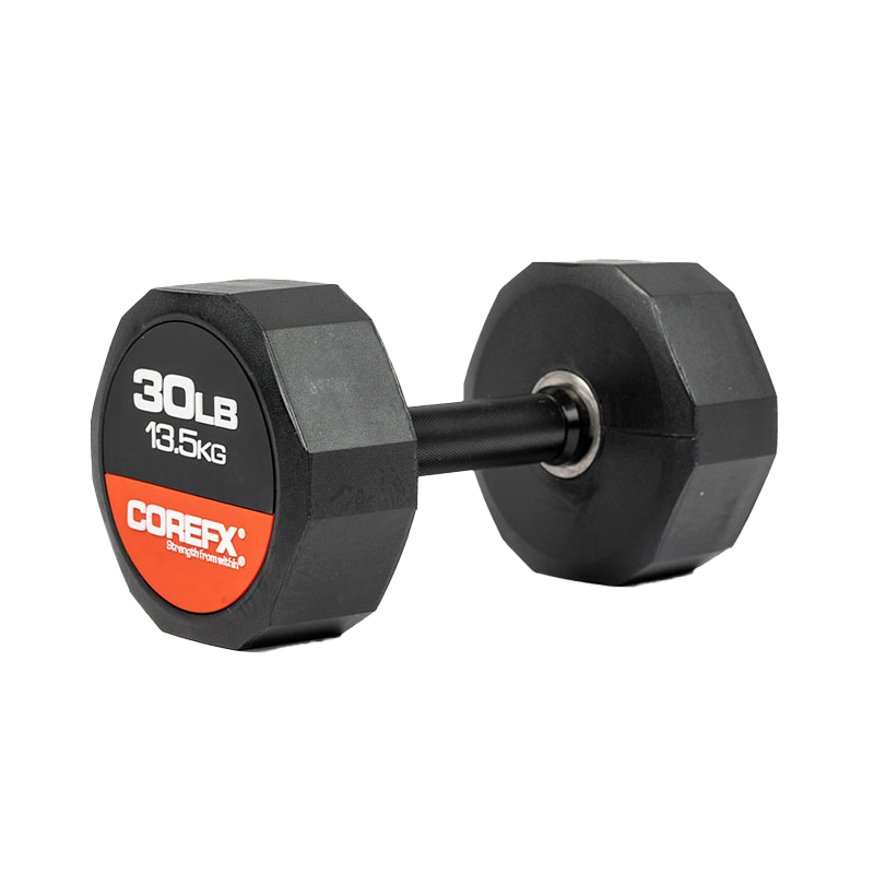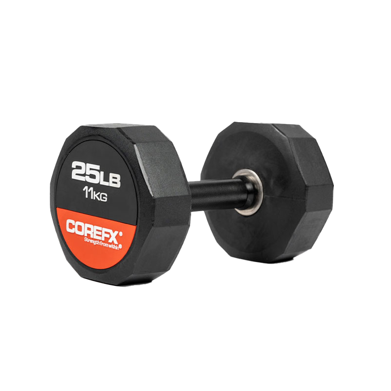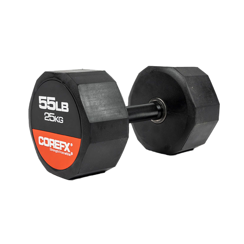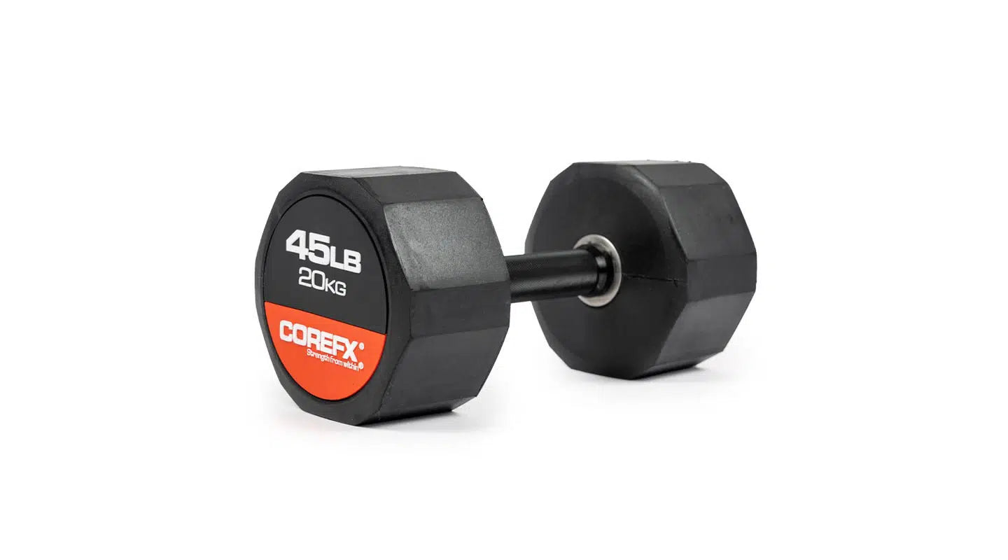 The COREFX rubber dumbbell features a precision-machined handle that maintains the same length across various weights. This ensures a safe grip and optimal use throughout your workouts.