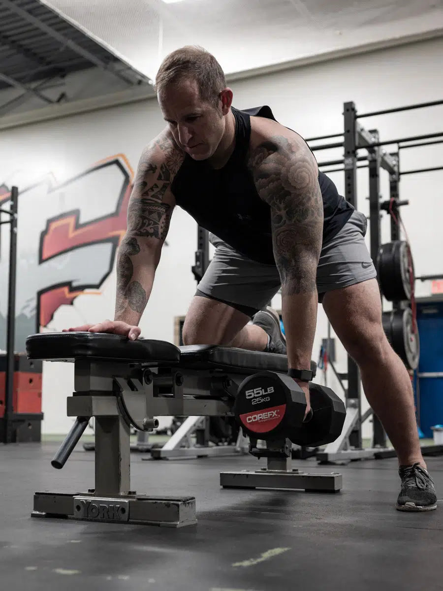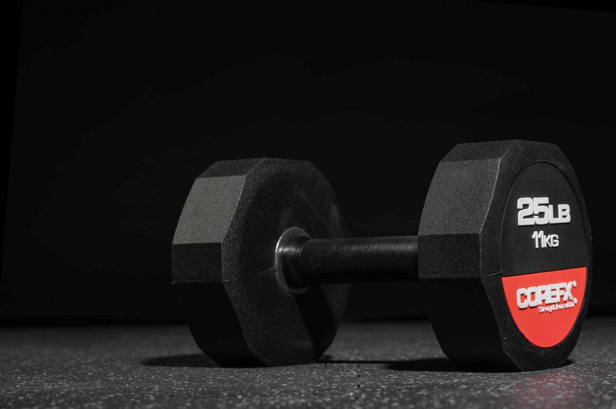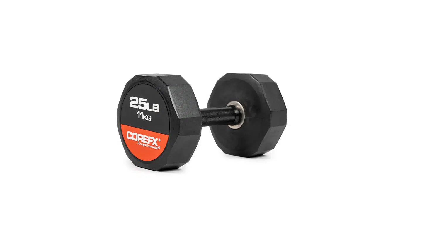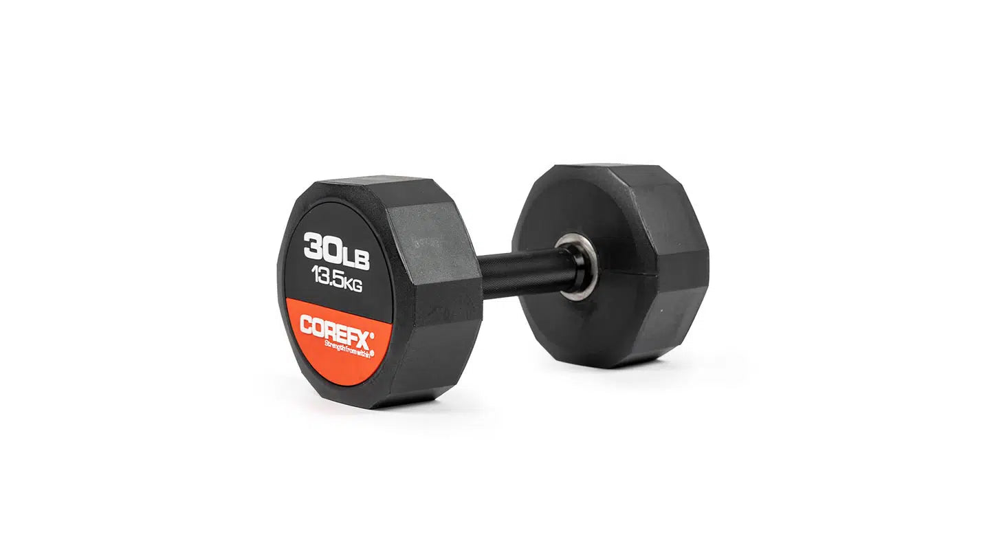 The COREFX rubber dumbbell features a precision-machined handle that maintains the same length across various weights. This ensures a safe grip and optimal use throughout your workouts.