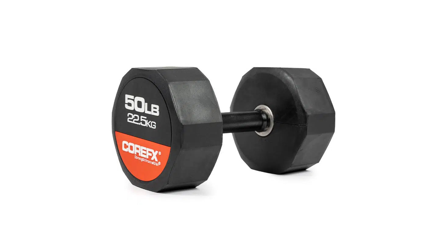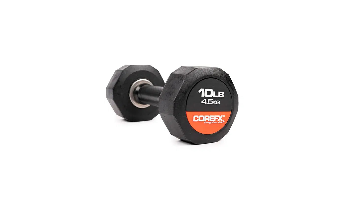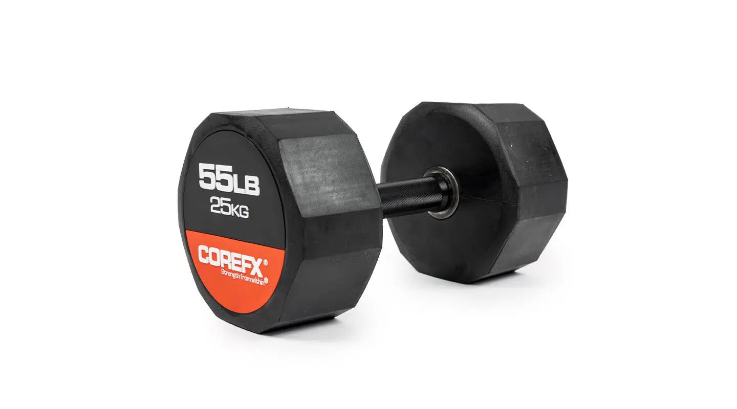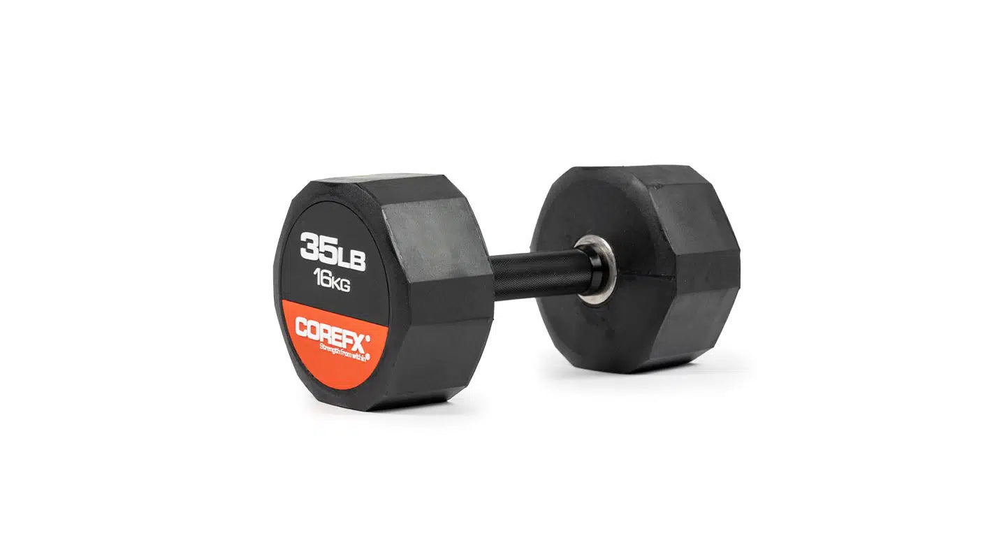 Rubber Dumbbell, the reliable fitness companion that gets you through your exercises in a fun and engaging way! Experience the luxury of owning your own set of dumbbells at home. Rubber Dumbbells allow you to tone and sculpt your muscles without needing to buy expensive machines. The COREFX Rubber Dumbbell features a unique 12-sided rubber coating to stop the weight from rolling and to help protect damage to your floors. Each precision-machined handle maintains the same length across various weights and its medium-grade knurling will ensure safe grip during your lifts. (Sold Individually)