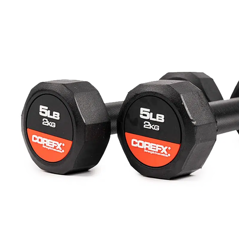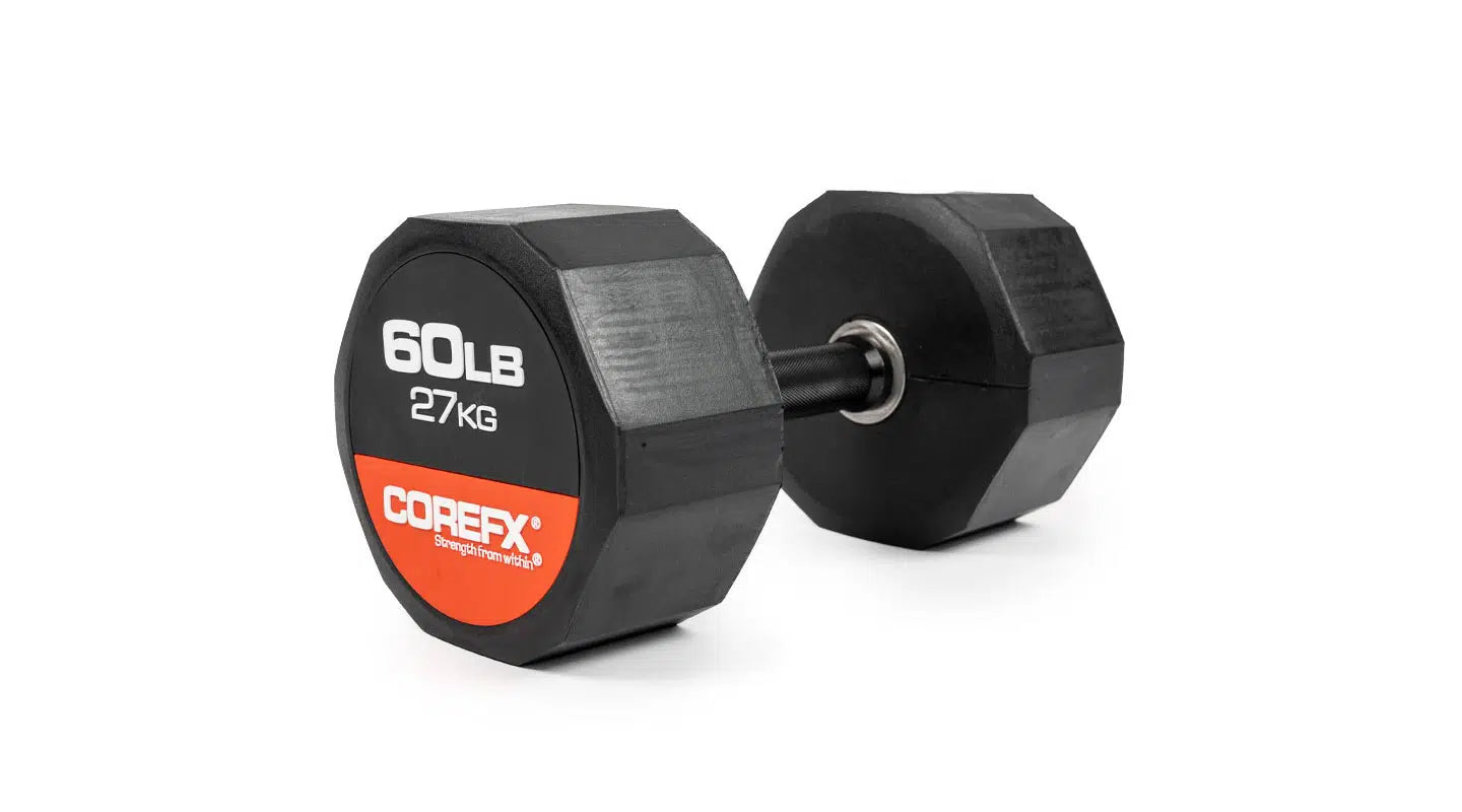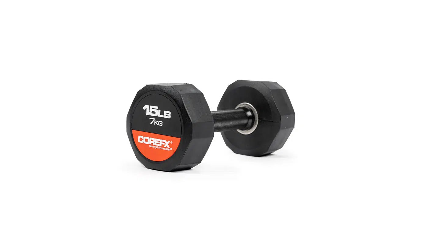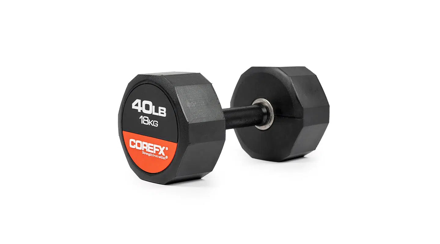 Rubber Dumbbell, the reliable fitness companion that gets you through your exercises in a fun and engaging way! Experience the luxury of owning your own set of dumbbells at home. Rubber Dumbbells allow you to tone and sculpt your muscles without needing to buy expensive machines. The COREFX Rubber Dumbbell features a unique 12-sided rubber coating to stop the weight from rolling and to help protect damage to your floors. Each precision-machined handle maintains the same length across various weights and its medium-grade knurling will ensure safe grip during your lifts. (Sold Individually)
