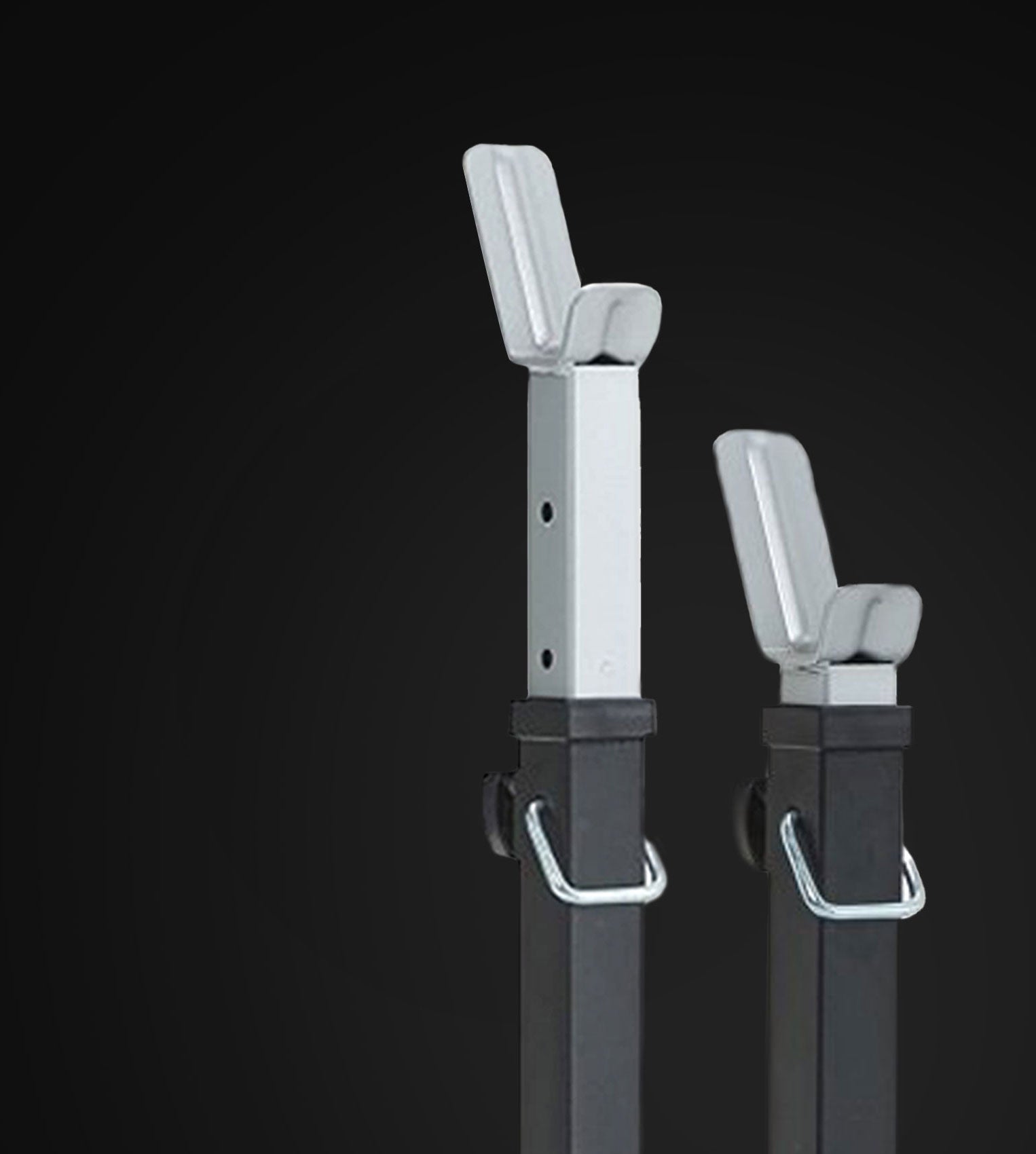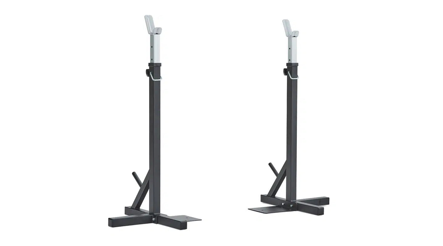 Each end adjusts to your desired height. Use as a traditional squat stand or in conjunction with a bench. Positioned for user defined distance.